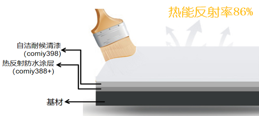 牧耘热反射涂膜系统采用 1 基层 1 表层的体系,既能达到个人作用又能起到良好的防水和保护功能。国家建筑材料测试中心的检测结果表明,牧耘热反射涂料能反射掉86%太阳光中的热量来源,高达87%的半球发射率,能迅速发射掉基材聚集的热量。